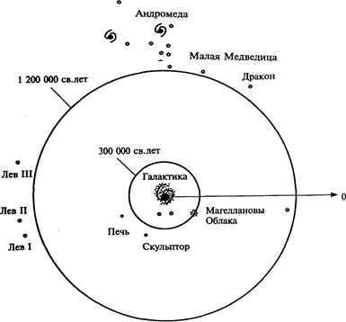 Рис.1. Местная группа галактик Вид галактики на фотобумаге несколько отличен от ее вида на негативе и зависит от того, в каких лучах был снят. Коллектив Астрономического института при Московском университете во главе с Б.А. Воронцовым - Вельяминовым составил "Морфологический каталог галактик" (MGC) из 30000 галактик ярче 17-й звездной величины и атлас взаимодействующих галактик. Оказалось, что некоторые галактики отличаются мощным радиоизлучением, которое больше оптического. Их назвали радиогалактиками (например, Лебедь А). Позднее стало ясно, что галактики не покоятся относительно расширяющегося недеформируемого фона, а имеют собственные движения, изучение которых позволит определить протяженность неоднородностей в распределении массы, а эти неоднородности очень велики и отражают сложные процессы начала расширения. Деление галактик на спиральные, эллиптические и неправильные, основанное на внешнем виде, было введено в 1925 г. американским астрономом Э. Хабблом, изучившим более тысячи галактик (рис.1). Его классификация отражает и существенные физические различия между галактиками. Спиральные галактики состоят из двух подсистем — дисковой и сферической. Сферическая часть напоминает эллиптическую галактику, дисковая — сжата и содержит много межзвездной пыли, газа и молодых звезд. Более молодые и яркие звезды сгруппированы в спиральные рукава. Оказалось, что почти половина галактик имеют спиральную форму. В центре таких галактик — красивое и яркое ядро, большое и тесное скопление звезд. Из ядра выходят закручивающиеся вокруг него ветви, состоящие из молодых звезд и облаков нейтрального газа. Таковы галактики Млечный Путь и туманность Андромеды. Эллиптические галактики несколько похожи на них, но с меньшими рукавами. Среди наиболее ярких галактик они составляют 25 %; считают, что они состоят из более старых звезд (возраста Солнца или старее), так как имеют красноватый оттенок. Они почти не содержат межзвездного газа, и там не формируются новые звезды. Вращение в них происходит с небольшими скоростями (менее 100 км/с), а равновесие поддерживается за счет хаотических передвижений звезд по радиально вытянутым орбитам. Такую галактику наблюдают в созвездии Девы, она имеет почти шаровидную форму и весьма активна. В ядре эллиптической радиогалактики Кентавра А удалось обнаружить на расстоянии в 106 св. лет отдельные детали размером в 100 св. лет, отражающие бурную активность. Неправильные галактики имеют небольшую массу и размер, в них много межзвездного газа. Заметны как очаги звездообразования какие-то клочки. Примером таких галактик являются наиболее близкие к Земле две небольшие галактики Магелланова Облака, которые даже называют спутниками Млечного Пути. До Большого Облака около 200 тыс. св. лет, до Малого — всего 170 тыс. св. лет. В Большом Облаке в 1987 г. Наблюдалась вспышка Сверхновой звезды, а при помощи обсерватории "Кванта" орбитального комплекса "Мир" в 1999 г. было зарегистрировано жесткое рентгеновское излучение. Наблюдения с помощью "Гранат" позволили подтвердить гипотезу о том, что в центре нашей Галактики – черная дыра, масса которой в миллионы раз больше солнечной. Отдельные звезды в галактиках стали различать только в 30-е гг. В 1923 г. Хаббл с помощью 2,5-метрового рефлектора открыл в спиральной туманности созвездия Андромеды 