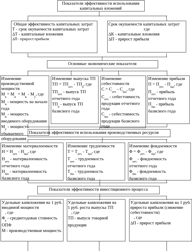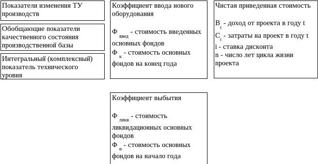 1.2. Технико-экономические показатели планирования Квалифицированное использование показателей, которые выполняют роль рабочего инструмента в процессе технико-экономического анализа является непременным условием его качественной реализации, обеспечивающим выявление реально существующих резервов повышения эффективности производства и создание благоприятной почвы для принятия конструктивных, экономически обоснованных управленческих решений. Методической базой разработки требований к системе показателей служат основополагающие принципы планирования НТП: научность, эффективность, комплексность. Для экономической оценки эффективности технического перевооружения наиболее значимым является выполнение таких требований как: 1) ориентация всей системы показателей на конечный результат, а также на доход предприятия; 2) обеспечение возможности планирования, измерения и оценки направления технического перевооружения по функциональным элементам производства на всех уровнях управления; 3) увязка разделов плана технического развития производства с планами технического перевооружения и планами между техническим уровнем и эффективностью производства, учета фактического эффекта от освоения новой техники; 4) обеспечение возможности использования планируемых и оценочных показателей совершенствования уровня для целей экономического и морального стимулирования, осуществление контроля и анализа за эффективностью использования затраченных на эти цели средства. Показатели анализа и эффективности качественного совершенствования производственной базы предприятия должны обеспечить в конечном счете оценку ретроспективных экономических результатов реализации мероприятий и плана технического перевооружения, изменения технического уровня производства, а также оценку его перспективных возможностей. Для технико-экономического анализа и оценки экономической эффективности затрат капитальных вложений на качественное совершенствование производственной базы предприятий предлагается использовать следующую систему показателей: 1. Основные показатели - абсолютная эффективность капитальных затрат; срок окупаемости капитальных вложений; прирост производственных мощностей; изменение выпуска товарной продукции; изменение себестоимости; изменение прибыли. 2. Дополнительные показатели: а) показатели, характеризующие эффективность использования производственных ресурсов, - изменение материалоемкости выпускаемой продукции, а также изменение ее трудоемкости и фондоемкости; б) показатели эффективности инвестиционного процесса - удельные капитальные вложения на единицу вводимой мощности, на 1 руб. увеличения выпуска товарной продукции, на 1 руб. прироста прибыли (снижение себестоимости); - показатели обновления основных производственных фондов, стоимость основных фондов, подлежащих ликвидации и замене, коэффициент ввода нового оборудования (в %), коэффициент выбытия (в %); - показатели изменения технического уровня производственной базы предприятия, интегральный и обобщающие показатели качественного состояния производства. Взаимосвязь и взаимозависимость показателей технического уровня производства основными показателями деятельности предприятия. Для определения экономического эффекта от технических мер