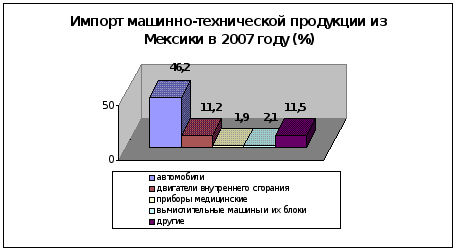 Структура импорта России из Мексики в 2007 году представлена двумя диаграммами, в одной из них представлены составляющие машинно-технической продукции (диаграмма № 2), а во второй общий объем импорта (диаграмма № 3): Диаграмма № 2