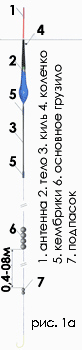 Рассмотрим пример. На рисунке 1а изображен поплавок стандартной для спорта конструкции, имеющий две точки крепления. Его составляющие элементы: антенна, тело, киль, колечко и кембрики на киле. Леска проходит через колечко и кембрики, которые и являются точками крепления. Поплавок огружен таким образом, что его тело полностью находится в воде, а над водой целиком остается антенна. Объем надводной части, т.е. антенны, определяет степень плавучести.