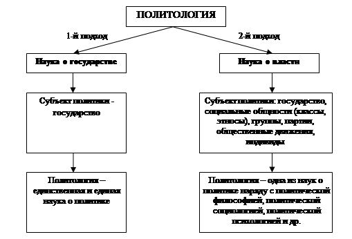 Рисунок 1. Подходы к определению предмета политологии Как и во всякой общественной науке, рамки предмета политологии изменчивы и подвижны. В наших условиях предмет ее расширился благодаря тому, что в политическую жизнь вошли такие понятия, как “президентское правление”, “экономическая интеграция”, межгосударственное содружество и др. Политология как наука постоянно развивается и располагает своими устойчивыми понятиями и категориями. К числу ключевых понятий относятся “политика”, “власть”, “демократия” и др. Важнейшими категориями являются “государство”, “политическая жизнь человека”, “политическая система”, “политическая партия”, “политическая деятельность”, “политическая культура” и т.п. Все они раскрывают различные стороны политической власти и возможности лидеров, социальных групп изменять и совершенствовать управление государством, обществом в интересах большинства людей. В чем состоит специфика предмета политологии? Во-первых, в том, что изучаемые ею вопросы не являются абстрактно-теоретическими, а уходят своими корнями в реальную жизнь, в социальную практику; что политические процессы и события неразрывно связаны с государственной властью и рассматриваются в контексте политической власти. Быть реалистом в политике - важнейшая заповедь искушенных деятелей. Во-вторых, в том, что в каждом самостоятельном государстве политология “привязана” к национальным особенностям, традициям, поэтому ее наблюдения, анализ ситуации, рекомендации более всего отражают цели и средства именно данной страны. То, что неоспоримо, например, для Японии, может вовсе не подойти для нашей республики. Политология оперирует категориями “народы”, “нации”, “власть”, “культура”, “прошлое”, “настоящее” и “будущее”. Все это отражено в ее содержании и структуре. Под структурой политологии понимается совокупность элементов и устойчивых связей ее объекта, обеспечивающих ее целостность, взаимодействие, порядок расположения основных проблем. Она вырабатывалась многими десятилетиями и странами. В 1948 г. комиссия ЮНЕСКО определила структуру политологии, в которую вошли следующие важнейшие разделы: 1) политическая теория (методологические основы теории и истории политической мысли); 2) политические институты и политические системы (изучение государства, партий, общественных организаций и движений); 3) социальные компоненты власти (формы и методы политического руководства обществом, правящая элита, политическое лидерство и т.д.); 4) политическая культура; 5) политическое поведение; 6) международные отношения и внешняя политика. Любая наука имеет определенную методологию - совокупность принципов, норм и методов познания. В исследовании своих проблем политология опирается на диалектико-материалистический метод, раскрывающий взаимосвязь между политикой и обществом, другими общественными явлениями, прежде всего экономикой, культурой, нравственностью. Этот метод позволяет понять политические события и явления во взаимной связи, в движении, и единстве и противоположности. Чаще всего используются общенаучные методы: анализ и синтез, индукция и дедукция, аналогия и моделирование. Широко применяется метод системного подхода, суть которого в том, что политические явления рассматриваются в их целостности, в постоянной измен
