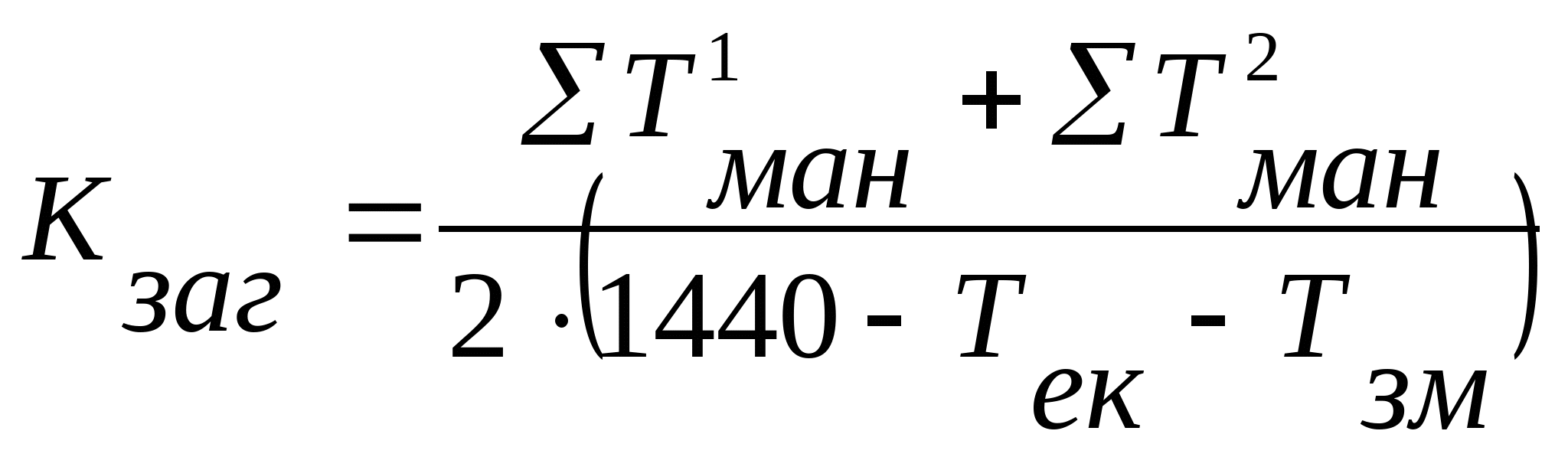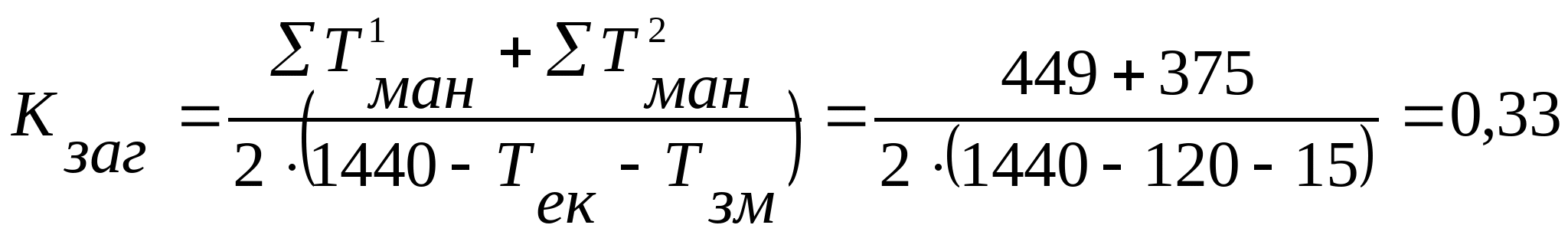 Простій вагона під однією вантажною операцією. Середній простій місцевого вагона під однією вантажною операцією визначаю по формулі:  де середній простій місцевого вагона; коефіцієнт здвоєних операцій. год Коефіцієнт використання маневрових локомотивів Коефіцієнт використання маневрових локомотивів визначаю окремо для кожного локомотива станції і середній для обох локомотивів по слідуючим формулам:    де сумарний час роботи за добу маневрового локомотива №1; сумарний час роботи за добу маневрового локомотива №2; час екіпірування маневрового локомотива в хвилинах за добу; час тривалості зміни бригад в хвилинах.    | | | | |