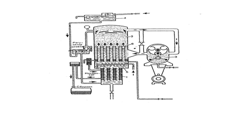 Рис. 1. Аквадистиллятор «Финн-аква». Условные обозначения: 1- регулятор давления; 2- конденсатор-холодильник; 3 - теплообменники трех корпусов камер предварительного нагрева; 4- парозапорное устройство линии технического конденсата; 5- система трубок теплообменников (зона испарения); 6 – трубы для подачи избытка воды в испаритель следующего корпуса; 7-труба для слива конденсата в конденсатор-холодильник; 8 - труба для поступления вторичного пара в холодильник 2 ; 9 - специальный теплообменник для дистиллята. Термокомпрессионный аквадистиллятор (рис. 2). Принцип работы состоит в следующем: деминерализованная вода подается в регулятор давления (4) и через регулятор уровня поступает в нижнюю часть конденсатора – холодильника (1 ) ,заполняет его межтрубное пространство и поступает в камеру предварительного нагрева (5) , а из нее - в трубки испарителя (6).Здесь вода закипает и пар заполняет межтрубное пространство (2) и откачивается компрессором (3).В камере испарения создается разряжение и вода в трубках закипает. Вторичный пар в компрессоре сжимается, проходит в межтрубное пространство и нагревает воду в трубках до кипения. В межтрубном пространстве образуется конденсат, который направляется в верхнюю часть конденсатора холодильника, охлаждается и собирается в сборник дистиллята.