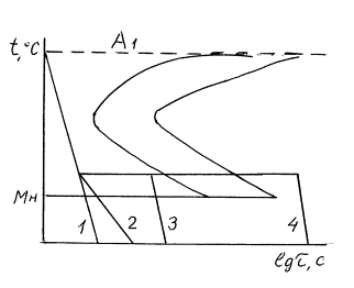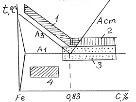 Рис. 1. Температурные интервалы нагрева различных видов отжига: 1 – полный и изотермический; 2 – неполный; 3 – отжиг на зернистый перлит; 4 – рекристаллизационный. Полный отжиг проводится для доэвтектоидных и эвтектоидных сталей. Температура нагрева на 30°-50°С выше А3, т.е. структуру полностью переводят в аустенитное состояние. После выдержки сталь медленно охлаждают в печи. Скорость охлаждения углеродистых сталей 100-150 °С/час, легированных - 30-40 °С/час. Структура стали после полного отжига получается феррито-перлитная, т.е. такая, как по диаграмме Fe-C. Неполный отжиг проводят практически для инструментальных заэвтектоидных сталей, только в том случае, если в структуре нет цементита по границам зерен (сетка цементита). Если есть сетка цементита, то для ее устранения применяют нормализацию, что будет рассмотрено ниже. Температура нагрева на 30°-50°С выше А1 (750°-780°С). При нагреве структура будет состоять из аустенита и цементита, после медленного охлаждения из перлита и цементита. Изотермический отжиг проводят с той же целью, что и полный, но время на его проведение требуется меньше (рис.2) [2].