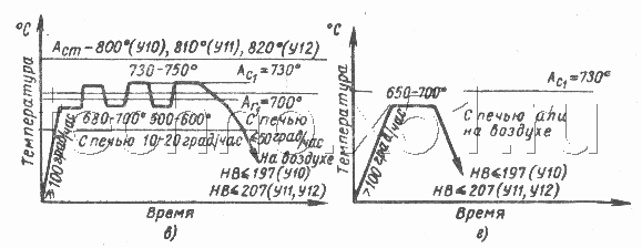 Рис. 2. Режим охлаждения при изотермическом (1) и полном отжиге (2). После нагрева до температуры на 30°-50°С выше А1, выдержке для выравнивания температуры по сечению, сталь подстуживают немного ниже А1 (650°-700°С) и выдерживают при этой температуре до полного распада аустенита на феррит и перлит, дальнейшее охлаждение с любой скоростью. В отличие от других видов отжига здесь распад аустенита проходит не при непрерывном охлаждении, а в изотермических условиях (при постоянной температуре). Проводить такой отжиг проще, т.к. контролировать температуру легче, чем скорость охлаждения. Изотермический отжиг обычно применяют для легированных сталей обладающих высокой устойчивостью аустенита (кривая изотермического распада сильно сдвинута вправо). Такой отжиг можно применять только для мелких заготовок, у которых температура по сечению выравнивается сравнительно быстро. Отжиг на зернистый перлит проводят с целью улучшить обрабатываемость резанием за счет снижения твердости при переводе пластинчатого перлита в зернистый. Такой отжиг применяют для эвтектоидной и заэвтектоидных сталей (при отсутствии сетки цементита) [1]. Отжиг проводят по одному из следующих режимов: 1. Нагрев на 20°-30°С выше А1, выдержка 3-5 часов, медленное охлаждение 2. Нагрев до тех же температур с небольшой выдержкой, охлаждение до 600°С, снова нагрев до 740°-750°С и снова охлаждение до 600°С. Такие циклы нагрева и подтуживания повторяют 2-4 раза, т.е. проводят как бы покачивание температуры стали около А1. Поэтому такой отжиг называют еще маятником отжигом. Графически режим маятникового отжига представлен на рис.3 [2].