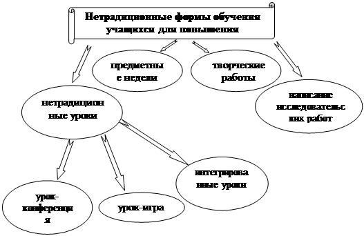 Схема № 2. Разные варианты нетрадиционных форм обучения предоставляют каждому обучающемуся возможность выбора. А свобода выбора повышает мотивацию к успешному выполнению выбранного задания. Учащиеся с хорошо развитым вкусом, пространственным мышлением охотно выполняют задания в виде рисунков, стараются придумывать свои рисунки, схемы. Участие обучающихся в уроках-конференциях, интегрированных уроках повышает качество обучения, развивает познавательный интерес к предмету. Полученные знания прочно запоминаются, так как в ходе такого урока обучающиеся рассуждают, анализируют, делают выводы. Особое место в работе по мотивации обучающихся к изучению информатики занимают игровые технологии. Элементы игры на уроках разнообразят учебную деятельность, развивают и поддерживают интерес к процессу обучения и предмету. Проведение предметных недель является одной из важных форм урочной и внеклассной работ по предмету. Она решает вопросы систематизации, обобщения знаний, способствует развитию познавательной активности обучающихся. Для развития познавательного интереса обучающихся при изучении информатики хорошо применять такой метод работы, как написание и защита исследовательских и творческих работ. Качество знаний при этом повышается, так как обучающиеся работают с различными источниками информации, отбирая необходимый материал, выполняют практическую часть, проводя исследовательскую работу, делая выводы. Постановка проблемного вопроса вначале урока или при выполнении различных видов работ, например, лабораторных, создает у обучающихся интеллектуальное затруднение, требующее активизации их поисковой мыслительной деятельности для разрешения поставленной задачи. Таким образом, в обеспечении успешности образовательного процесса большую роль играет способность педагога пробудить в обучающихся мотивацию к изучению предмета с целью развития познавательного интереса и повышения качества обучения. Глава 3. Обобщение и систематизация знаний в процессе обучения Урок обобщения и систематизации применяется вместо традиционного урока повторения учебного материала. Необходимость такого урока вызвана следующими обстоятельствами. Урок повторения, как правило, преследовал цели закрепления знаний и реализации дидактического принципа прочности знаний. Этой цели соответствует и методика урока повторения, которая заключалась в устном опросе или беседе по изученной теме или разделу. Вопросы предусматривали в основном воспроизведение учебного материала в такой последовательности, как он изучался на уроках. Связи и отношения между событиями, понятиями, признаками и свойствами предметов и явлений не всегда устанавливались, такая задача обычно и не ставилась. Не ставилась и не решалась задача системности знаний. Подобная организация повторения отрицательно сказывалась на качестве знаний, они становились непрочными, фрагментарными, не связанными в стройную и четкую систему. Поэтому возникла необходимость разработки структуры и методики такого урока, основная дидактическая цель которого – приведение усвоенных учащимися понятий в стройную систему, предусматривающую раскрытие и усвоение связей и отношений между ее элементами. Конечным результатом усвоения таких систем знаний является сознательное овладение 