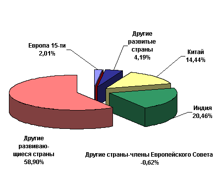 Рис. 1. Структура прироста численности населения мира за 2006 год, % (по материалам сайта http :// www . demoscope . ru ) Вместе с тем эти страны вследствие своей экономической, социальной и культурной отсталости меньше всего способны обеспечить своё удваивающееся каждые 20-30 лет население продовольствием, а также другими материальными благами, дать хотя бы элементарное образование подрастающему поколению и предоставить работу населению в трудоспособном возрасте. Кроме того, быстрый рост населения сопровождается своими специфическими проблемами, одной из которых является изменение его возрастной структуры: доля детей до 15 лет на протяжении последних трёх десятилетий увеличилась в большинстве развивающихся стран до 40-50% их населения. В результате значительно выросла так называемая экономическая нагрузка нетрудоспособного населения на трудоспособное, которое ныне в этих странах почти в 1,5 раза превышает соответствующий показатель в промышленно развитых странах. А с учётом более низкой общей занятости трудоспособного населения в развивающихся странах и огромного относительного аграрного перенаселения в большинстве из них, самодеятельное население испытывает фактически ещё более значительную экономическую перегрузку. Как показывает опыт целого ряда стран, снижение темпов роста населения зависит от многих факторов. К таким факторам относятся обеспечение всего населения жильём должного качества, полная занятость, свободный доступ к образованию и медицинскому обслуживанию. Последнее же невозможно без развития национальной экономики на основе индустриализации и модернизации сельского хозяйства, без развитития просвещения и образования, решения социальных вопросов. Исследования, проведенные в последние годы в ряде стран Азии и Латинской Америки, показывают, что там, где уровень экономического и социального развития наиболее низок, где большинство населения неграмотно, рождаемость очень высока (см. карту 3 ), хотя во многих из них и проводится политика по регулированию рождаемости, и наоборот, налицо её снижение при прогрессивных экономических преобразованиях[7].