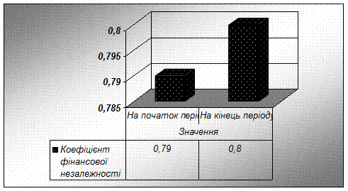 Таким чином, на одну одиницю коштів вкладених у запаси, припадає 3,55 грн. власних, довгострокових та короткостроких зобов’язань. Відбулося збільшення на 1,5 або 73,17%. Коефіцієнт фінансової незалежності: характеризує можливість підприємства виконати зовнішні зобов’язання за рахунок власних активів; його незалежність від позикових джерел. Нормативне значення: Кавт.>0.5.