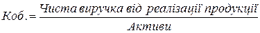 Нормативне значення: збільшення за періоди. Коефіцієнт характеризує наскільки ефективно використаються активи з погляду обьема реалізації, оскільки показує, скільки гривень реалізації доводиться на кожну гривню, вкладену в активи підприємства.