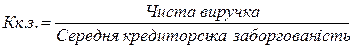 Кількість оборотів дебіторської заборгованості в порівнянні з минулим періодом зменшилася в 10 разів. Цей показник показує яку суму грошей підприємство могло вкласти у виробничу діяльність й одержати доход, але воно цього не зробило, тому що частина грошей була спрямована на товарний кредит. Строк погашення кредиторської заборгованості (днів)розрахуємо за формулою: