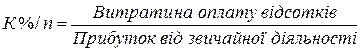 Таким чином, в звітному році менша частка прибукту у порівнянні з попереднім роком була направлена на збільшення власного капіталу, скорочення становило 0,05. Співвідношення сплачених відсотків і прибутку: показує скільки припадає ссплачених відсотків за кредити та позики на 1-цю прибутку, яку частину ефекту «з’їдає кредит». Нормативне значення: зменшення свідчить про ефективність використання позик. У зарубіжній практиці до 38,8% - нормальне значення, понад – 88,6% - тривожне.