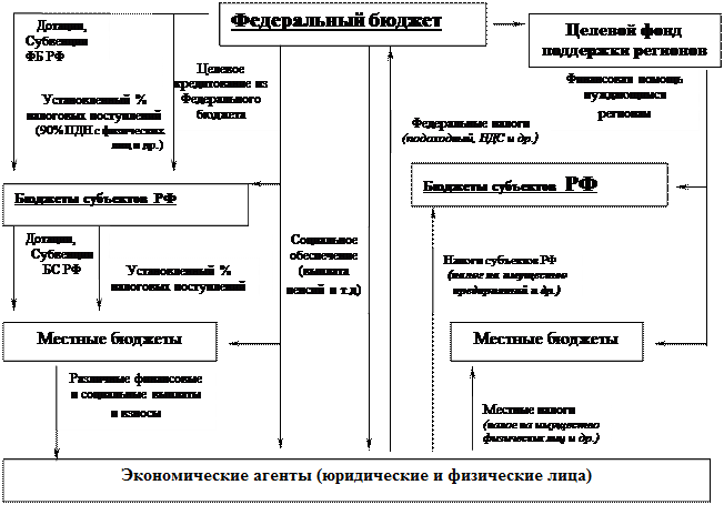 Схема.1 . Взаимосвязи в бюджетной системе РФ. Государственный бюджет активно воздействует на экономику в целом, так как он выступает в качестве бюджета всего национального хозяйства. Большую роль играет государственный бюджет в сфере материального производства выступая в качестве стимулятора его роста. Средства бюджета используются для обеспечения как индивидуального (в рамках отдельных предприятий), так и общественного (в масштабе всего национального хозяйства) кругооборота фондов. В ходе формирования доходов бюджета и использования бюджетных средств решаются задачи государственного регулирования экономических и социальных процессов в стране. В процесс е образования доходов бюджета происходит императивное изъятие в пользу государства части национального дохода. На этой основе возникают финансовые взаимоотношения Государства с предприятиями и населением. Бюджет активно участвует в распределении прибыли предприятий и хозяйственных организаций. Существует известная зависимость между формами и величиной изъятия в бюджет части прибыли предприятий и их заинтересованностью в результатах работы. От того, насколько совершенны формы изъятия в бюджет части прибыли, зависит заинтересованность предприятий в лучшем использовании производственных ресурсов, повышении уровня рентабельности и увеличении прибыли. Путем централизации в бюджете части финансовых ресурсов государство получает возможность обеспечивать денежными средствами общегосударственные потребности - ускоренное развитие прогрессивных отраслей народного хозяйства, воспроизводство квалифицированной рабочей силы, развитие науки и техники, обороноспособность страны. Посредством бюджета национальный доход перераспределяется по территории, а также из производственной в непроизводственную сферу, для чего за счет бюджета создаются денежные фонды для финансирования потребностей в области здравоохранения, образования, культуры, управления, обороны. Через бюджеты путем бюджетного финансирования перераспределяются финансовые ресурсы между отраслями производственной сферы в целях их пропорционального развития. Пользуясь бюджетом как основным орудием перераспределения национального дохода, государство направляет средства в первую очередь в те отрасли народного хозяйства и те экономические районы, которые требуют на данном этапе первоочередного развития, Т.е. посредством бюджета производится межтерриториальное и межотраслевое перераспределение национального дохода. Тем самым соблюдаются интересы экономического развития страны в целом и интересы пропорционального развития регионов. Через государственный бюджет проходит финансирование научных учреждений, осуществляющих фундаментальные научные исследования, которые, в свою очередь, являются основой для развития прикладной науки и создания новой техники. Направляя через бюджет необходимые средства в наиболее перспективные отрасли науки, государство тем самым обеспечивает развитие производительных сил страны. Все это позволяет координировать экономическую жизнь государства, рационально размещать денежные и материальные ресурсы во всем народном хозяйстве, способствует техническому прогрессу и усиливает экономический потенциал государства. Большую роль в экономическом и кул