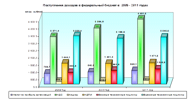 3.1.2. Законопроектом за 2009 - 2011 годы прогнозируется увеличение общего объема доходов в реальном выражении на 2,0 %, или на 0,7 % в среднем за год (за 2006 - 2008 годы увеличение общего объема доходов в реальном выражении составило 18,5 %, или на 5,8 % в среднем за год). Динамика поступления доходов в федеральный бюджет в 2009 – 2011 годах представлена на следующей диаграмме.
