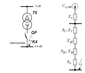 Рисунок 5.1 – Принципова схема і схема заміщення для розрахунку три фазного КЗ в мережі 0,4 кВ