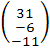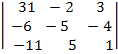 = (31)(-5)1 + (-6)(5)3 + (-11)(-2)(-4) – (-11)(-5)(3) – (31)(5)(-4) – (-6)(-2)(1) = - 155 – 90 – 88 – 165 + 620 – 12 = 110