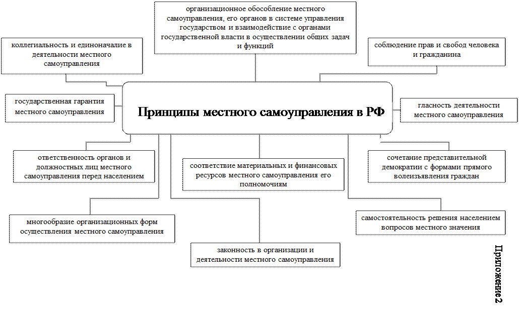 17 -Федеральный закон от 25 сентября 1997 г. «О финансовых основах местного самоуправления в Российской Федерации» // СПС Гарант Максимум. – ст.2 ·гарантируют право представительных органов местного самоуправления самостоятельно определять направления использования средств местных бюджетов; самостоятельно распоряжаться свободными остатками средств местных бюджетов, образовавшимися в конце финансового года в результате увеличения поступления доходов или уменьшения расходов; ·компенсацию увеличения расходов или уменьшения доходов местных бюджетов, возникших вследствие принятия федеральных законов и законов субъектов РФ, а также иных решений органов государственной власти. Формирование местного бюджета осуществляется путем применения единой методологии, государственных минимальных социальных стандартов, социальных норм, устанавливаемых органами государственной власти. Глава муниципального образования, иные должностные лица местного самоуправления несут ответственность за исполнение местных бюджетов в соответствии с федеральными законами, законами субъектов РФ, уставами муниципальных образований. Сведения об исполнении местного бюджета за истекший финансовый год обязательно публикуются. Помимо основ местного самоуправления Конституцией РФ установлены и его основные принципы, которые получили развитие и закрепление в ФЗ «Об общих принципах организации местного самоуправления в РФ». По степени охвата принципы местного самоуправления можно подразделить на основные (общие) и частные. О.Е. Кутафин, В.И. Фадеев дают следующее определение общих принципов местного самоуправления: «... это закрепляемые Конституцией РФ, федеральными законами, обусловленные природой местного самоуправления коренные начала и идеи, лежащие в основе организации и деятельности населения, формируемых им органов, самостоятельно осуществляющих управление местными делами и обязательные для федеральных органов государственной власти, органов государственной власти субъектов Федерации и муниципальных образований»18 . К общим принципам местного самоуправления они относят: а) самостоятельность решения населением вопросов местного значения; б) организационное обособление местного самоуправления, его органов в системе управления государством и взаимодействие с органами государственной власти в осуществлении общих задач и функций; в)сочетание представительной демократии с формами прямого волеизъявления граждан; г)соответствие материальных и финансовых ресурсов местного самоуправления его полномочиям; д) ответственность органов и должностных лиц местного самоуправления перед населением; е)многообразие организационных форм осуществления местного самоуправления; ж) соблюдение прав и свобод человека и гражданина; э) законность в организации и деятельности местного самоуправления; и) гласность деятельности местного самоуправления; к)коллегиальность и единоначалие в деятельности местного самоуправления; л) государственная гарантия местного самоуправления.(см. Приложение 2)