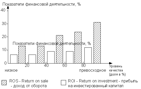 На рис. 2.4 показаны уровни полученных доходов от сбыта (ROS, Return on Sale – доход от оборота) и прибыль на инвестиции (ROI, Return on Investment – прибыль на инвестированный капитал). Эти показатели выше у производителей продукции более высокого качества.