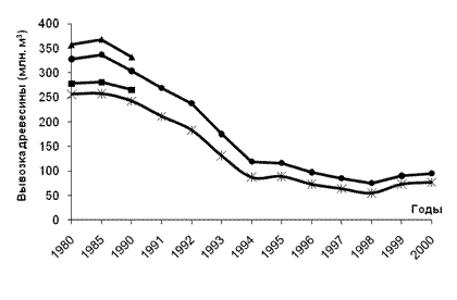Более существенной причиной сокращения лесных запасов является действие антропогенного фактора. Как видно из приведенной таблицы 9.2, на его долю падает более 90% площадей погибших лесов. И главное здесь — лесные пожары, 90% которых происходит по вине человека. За 1995-2000 гг. площадь погибших лесных насаждений по причине пожаров составила почти 2 млн. га. Только в 2000 г. зарегистрировано 22 тыс. лесных пожаров (в т.ч. более 1 тыс. крупных), в которых сгорело 39 млн. м3 древесины, а ущерб составил примерно 3,4 млрд. руб. Гибнет лес также из-за загрязнения окружающей среды. Только общая площадь радиоактивного загрязнения лесов составляет 3,5 млн. га, из которых 1 млн. га приходится на Чернобыльскую зону, 2 млн. га — на Алтайский край и 0,5 млн. га — на Уральский регион. Хозяйственные причины сокращения запасов лесных ресурсов обусловлены объемами и методами заготовки древесины, а также последующими этапами ее доведения до конечного потребителя. В этом же ряду следует отметить процессы хозяйственного освоения территорий (строительство, прокладку дорог, нефте- и газопроводов), сопряженные с вырубкой древесины. 1.3 Использование лесных ресурсов. Рис. 1.1 Вывоз древесины в СССР и РФ