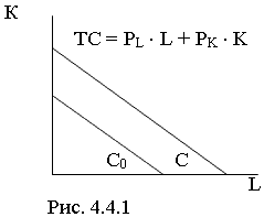 где ТС (totalcosts) – совокупные издержки, w - ставка заработной платы (другой вариант написания - PL ), r - цена (процент) использования капитала (другой вариант написания - PK ), L , K - количество труда и капитала. Информация об уровне издержек позволяет графически построить изокосту (линию равных затрат).