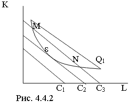 Изокоста включает в себя все возможные сочетания труда и капитала, которые имеют одну и ту же суммарную стоимость, то есть все сочетания факторов производства с равными валовыми издержками. Изокоста графически представляет собой прямую линию, которая определяется двумя предельными точками – максимальным количеством труда и капитала, которое может приобрести фирма. Изокоста имеет угловой коэффициент, равный отношению цен факторов производства, взятому с отрицательным знаком Это следует из уравнения изокосты: Используя изокосту, можно определить какой набор факторов производства обеспечивает заданный выпуск с наименьшими совокупными издержками (ТС). Решение данной проблемы – в точке касания () изокосты с изоквантой, которая отражает равновесие производителя .