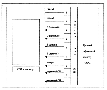 Рис.1. Схема подключения CGA-монитора к адаптеру. (Уровни всех сигналов соответствуют ТТЛ-уровням: “1” - 2,4 В; “0” - 0-0,4 В). Цифровые мониторы,напротив,обеспечивают вывод лишь ограничен-ного числа цветов. Они позволяют включать/выключать по одному кана-лу только один уровень яркости. Управление несколькими уровнями интенсивности приходится разделять по разным проводам, как цвета в RGB -мониторах. Так, цифровой монитор Color Grafics Monitor фирмы IBM, чаще называемый просто CGA-монитором, получает информацию о цвете точки по четырем линиям. Три из них включают/выключают основные цвета (рис.1),а сигнал по четвертому увеличивает яркость сразу всех цветов. Такая система управления называется RGBI, буква I обозначает интенсивность и позволяет отображать различные пикселы в одном из 16 возможных цветов. В таблице 1 показана зависимость цвета пиксела от кодовой комбинации на RGBI - линиях. Цветовая палитра для CGA - монитора. Таблица 1. +------------------------------------------------------------------+ ¦ N% ¦ Наличие сигнала ¦ ¦ ¦ цвета ¦ на линии ¦ Цвет пиксела ¦ ¦ +------------------¦ ¦ ¦ ¦ I R G B ¦ ¦ ¦-------+------------------+---------------------------------------¦ ¦ 1 ¦ 0 0 0 0 ¦ черный ¦ ¦ 2 ¦ 0 0 0 1 ¦ синий ¦ ¦ 3 ¦ 0 0 1 0 ¦ зеленый ¦ ¦ 4 ¦ 0 0 1 1 ¦ голубой (циан) ¦ ¦ 5 ¦ 0 1 0 0 ¦ красный ¦ ¦ 6 ¦ 0 1 0 1 ¦ сиреневый (магента) ¦ ¦ 7 ¦ 0 1 1 0 ¦ коричневый ¦ ¦ 8 ¦ 0 1 1 1 ¦ белый ¦ ¦ 9 ¦ 1 0 0 0 ¦ серый ¦ ¦ 10 ¦ 1 0 0 1 ¦ ярко-синий ¦ ¦ 11 ¦ 1 0 1 0 ¦ ярко-зеленый ¦ ¦ 12 ¦ 1 0 1 1 ¦ ярко-голубой ¦ ¦ 13 ¦ 1 1 0 0 ¦ ярко-красный ¦ ¦ 14 ¦ 1 1 0 1 ¦ ярко-сиреневый ¦ ¦ 15 ¦ 1 1 1 0 ¦ желтый ¦ ¦ 16 ¦ 1 1 1 1 ¦ ярко-белый ¦ +------------------------------------------------------------------+ Еще один представитель цифровых мониторов фирмы IBM - усовершенствованный цветной монитор EGD (Enhanged Graphics Display), называемый обычно EGA - монитором. Он допускает вывод 64-х цветов, и для этого принимает сигнал по шести каналам, обозначаемых буквами rgbRGB. Линии r,g,b управляют 50-процентным уровнем интенсивности каждого из основных цветов. До последнего времени использование аналоговых мониторов было затруднительным из-за отсутствия относительно дешевых адапте-ров, обеспечивающих формирование аналоговых, а не цифровых сигналов управления цветом. Ситуация существенно изменилась в 1987г.,когда фирма IBM начала выпуск адаптера VGA (Video Graphics Array) и предназначенных для работы с ним аналоговых мониторов. VGA поддерживает одновременную работу с любыми 256 цветами из палитры, состоящей из 262144 цветов. И для этого необходимо только три линии связи с монитором - R,G и B. Цветовая палитра, воспроизведенная аналоговым монитором, практически безгранична. Следует отметить, что VGA является универсальным адаптером, так как его программный интерфейс совместим с программным интерфейсом усовершенствованного графического адаптера EGA. Совместимость означает, что большинство программ, написанных для EGA, без изменений пойдут и на VGA. В настоящее время различные фирмы выпускают несколько сотен видов адаптеров. Такое разнообразие адаптеров натолкнуло разработчиков японской фирмы NEC на создание универсального монитора, который мог бы работать под управлением широкого класса адаптеров. Этот монитор получил название “мультисинк”. Он способен автоматически синхронизироваться с различными адаптерами, меняя для этого в широких пределах частоту кадров, строк и видеосигналов. Кроме того, этот монитор можно переключать из цифрового режима работы в аналоговый и обратно. В результате своей универсальности мониторы “