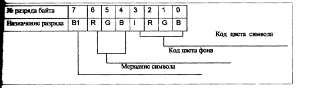 Рис.2. Структура байта атрибутов. Назначение 7-го бита байта атрибутов может программно измениться. Пользователь может определить этот бит как бит интенсивности цветов фона (аналогично биту 3,определяющему интенсивность цветов символа),или же как бит, задающий мерцание символа. Итак, Вы уже знаете, что в буфере хранится информация, которая много о чем говорит адаптеру - какие символы и в каких позициях экранной страницы они должны выводиться, какой цвет каждого символа и на каком фоне должен отображаться этот символ и др. Как же адаптер преобразует эту информацию в видеосигналы, т.е. в сигналы, единственно понятные монитору? Вы уже знаете, что мельчайшим элементом изображения на экране монитора является пиксел (picture element). Наименьшим же элементом экранной страницы является знакоместо, в котором может одновременно отображаться только один символ. Большинство видеоадаптеров ПЭВМ определяют знакоместо как матрицу из 8 пикселов по вертикали (8 телевизионных строк) и такого же количества пикселов по горизонтали. В этом случае между форматом символьной страницы на экране монитора и его разрешением справедливы следующие соотношения : N=V/8; M=H/8, (2) где N и M - максимальное количество символьных строк и символов в строке соответственно; V и H - разрешение монитора по вертикали и горизонтали соответственно. (Определите текстовый формат для монитора с разрешением 640*200 пиксел) Любой символ может быть отображен в знакоместе путем активизации тех или иных пикселов матрицы. Так, например, для отображения буквы “A” должны быть активизированы 4-й и 5-й пикселы в 1-й строке матрицы,3-й и 6-й - во второй строке,2 и 7 - в 3,4,6,7 и 8-й строках, а в 5-й строке необходимо активизировать 2,3,4,5,6 и 7-й пик-сел.(Проверьте это, нарисовав матрицу из 8-ми строк и 8-ми столбцов и закрасив указанные элементы матрицы). Состояние элементов матрицы для любых символов легко кодировать двоичным кодом и хранить в памяти адаптера, если условиться, что состояние элементов (пикселов) каждой отдельной строки матрицы хранится в отдельной байте, причем в старшем(седьмом) бите каждого байта хранится состояние 1-го пиксела, в шестом бите - состояние 2-го пиксела и т.д. до нулевого бита, который характеризует состояние 8-го пиксела матричной строки(пикселы и строки в матрице символа отсчитываются с левого верхнего угла матрицы вправо и вниз соот-ветственно). Таким образом,каждый символ может быть описан восемью байтами. Первый байт хранит состояние восьми пикселов первой строки матрицы,второй байт - состояние пикселов второй строки и т.д. Ак-тивность того или иного пиксела задается установкой соответствую-щего ему разряда в байте строки. Для рассмотренного примера с бук-вой “A” последовательность байт будет следующей: 0 0 0 1 1 0 0 0 - байт 1-й строки символа 0 0 1 0 0 1 0 0 - байт 2-й строки символа 0 1 0 0 0 0 1 0 - байт 3-й строки символа 0 1 0 0 0 0 1 0 - байт 4-й строки символа 0 1 1 1 1 1 1 0 -||- 5-й -||- 0 1 0 0 0 0 1 0 -||- 6-й -||- 0 1 0 0 0 0 1 0 -||- 7-й -||- 0 1 0 0 0 0 1 0 -||- 8-й -||- Такие восьмибайтные массивы, описывающие различные символы, хранятся в специальной памяти видеоадаптера, называемой знакогенератором. А однобайтные ASCII-коды символов (эти коды загружаются микропроцессором в видеобуфер) являются указателями на ячейку памяти в знакогенераторе, в которой хранится байт первой строки матрицы данного символа. Адрес этой ячейки вычисляется умножением ко
