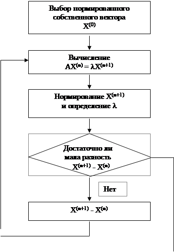 Важность трехдиагональной формы обусловлена тем, что некоторые методы преобразований подобия позволяют привести произвольную матрицу к этому частному виду. 3. Матрица A называется ортогональной, если АТ А = Е, где Ат —транспонированная матрица A, а Е—единичная матрица. Очевидно, матрица, обратная ортогональной, эквивалентна транспонированной. 4. Матрицы А иВ называются подобными, если существует такая несингулярная матрица Р, что справедливо соотношение В = Р-1 АР. Основные свойства собственных значений. 1. Все п собственных значений симметричной матрицы размерности пХп, состоящей из действительных чисел, действительные. Это полезно помнить, так как матрицы, встречающиеся в инженерных расчетах, часто бывают симметричными. 2. Если собственные значения матрицы различны, то ее собственные векторы ортогональны. Совокупность п линейно независимых собственных векторов образует базис рассматриваемого пространства. Следовательно, для совокупности линейно независимых собственных векторов X i , где i == 1,. . ., n, любой произвольный вектор в том же пространстве можно выразить через собственные векторы. Таким образом, n Y = S ai Xi . i=1 3. Если две матрицы подобны, то их собственные значения совпадают. Из подобия матриц A и В следует, что В = Р-1 АР. Так как АХ = lХ , то Р-1 АХ = lР-1 Х. Если принять Х == РY , то Р-1 АРY = l Y , а ВY == l Y . Таким образом, матрицы A и В не только имеют одинаковые собственные значения, но и их собственные векторы связаны соотношением Х = Р Y . 4. Умножив собственный вектор матрицы на скаляр, получим собственный вектор той же матрицы. Обычно все собственные векторы нормируют, разделив каждый элемент собственного вектора либо на его наибольший элемент, либо на сумму квадратов всех других элементов. 3 . ИТЕРАЦИОННЫЕ МЕТОДЫ РЕШЕНИЯ. Пожалуй, наиболее очевидным способом решения задачи на собственные значения является их определение из системы уравнений (A - lE)Х == 0, которая имеет ненулевое решение лишь в случае, если det(A - lE)=0. Раскрыв определитель, получим многочлен п -йстепени относительно l, корни которого и будут собственными значениями матрицы. Для определения корней можно воспользоваться любым из методов, описанных в гл. 2. К сожалению, в задачах на собственные значения часто встречаются кратные корни. Так как итерационные методы, в этих случаях не гарантируют получение решения, то для определения собственных значений следует пользоваться другими итерационными методами. Определение наибольшего собственного значения методом итерацийНа рис. 1 показана блок-схема простейшего итерационного метода отыскания наибольшего собственного значения системы AХ =lХ. Процедура начинается с пробного нормированного вектора X(0 ) . Этот вектор умножается слева на матрицу A, и результат приравнивается произведению постоянной (собственное значение) и нормированному вектору X(0 ) .. Если вектор X(0) совпадает с вектором X(0 ) , то счет прекращается. В противном случае новый нормированный вектор используется в качестве исходного и вся процедура повторяется. Если процесс сходится, то постоянный множитель соответствует истинному наибольшему собственному значению, а нормированный вектор — соответствующему собственному вектору. Быстрота сходимости этого итерационного процесса зависит от того насколько удачно выбран начальный вектор. Если он близок к истинному собств