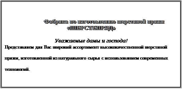 1. Характеристика фирмы. 1.1. Название фирмы и его обоснование. Компания «Шерстепряд» является частным производственным предприятием. По организационно-правовой форме хозяйствования «Шерстепряд» представляет собой закрытое акционерное общество. Название «Шерстепряд» является сокращенным от полного «Шерстенная пряжа», что довольно ясно объясняет предназначение продукции, выпускаемой данным предприятием. Юридический адрес предприятия: 127000, г. Москва, ул. Академика Королева, д. 12. 1.2. Вид деятельности. По виду хозяйственной деятельности ЗАО «Шерстепряд» представляет собой промышленно-производственное предприятие, которое специализируется на выпуске шерстяной пряжи, и дальнейшей ее реализации. 1.3. Продолжительность работы на рынке. ЗАО «Шерстепряд» работает на рынке производства данной продукции в течении 9 лет, имеет постоянных потребителей, и создает все условия для привлечения новой базы клиентов. 1.4. Ассортимент выпускаемой продукции. ЗАО «Шерстепряд» занимается производством шерстяной пряжи. В целом деятельность предприятия характеризуется следующим ассортиментом выпускаемой продукции: Таблица 1 Ассортимент выпускаемой продукции.