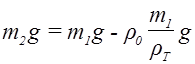 З іншого боку P2 =m2 g, де m2 - маса важків при зважуванні, а FA =ρ0 Vg, де V - об’єм тіла. Отже: