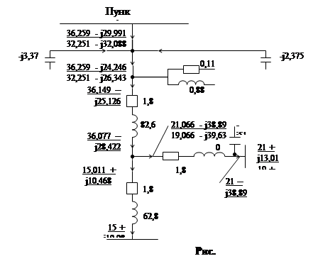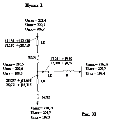 где: U А - заданное напряжение начала расчетного звена, кВ U 1 - напряжение конца звена, кВ Р - активная составляющая мощности начала звена, МВт Q - реактивная составляющая мощности начала звена, Мвар R - активное сопротивление звена, Ом X - индуктивное сопротивление звена, Ом Вычисление напряжений на шинах ВН подстанций. Схема остается той же (рис. 29, 30). Там имеются потоки мощности и сопротивления участков. Предварительно вычисляем напряжения в линии во всех режимах. Например, максимальный режим: