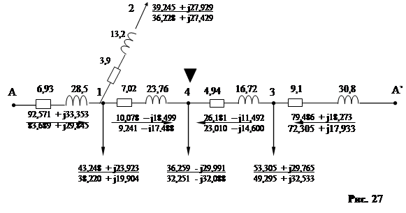 где P , Q — активная и реактивная мощность линии, R , X — активное и реактивное сопротивление линии, U — номинальное напряжение линии (кВ). Например, участок А – 1: