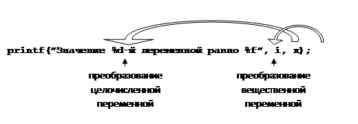 Здесь верхние стрелки указывают позиции внутри форматной строки, куда будут выведены значения переменных i и x. Остальной текст форматной строки будет отображен без изменения. К примеру, если переменная i к моменту выполнения этого оператора имела значение 5, а переменная x была равна 1.5, на экран будет выведено: «Значение 5‑й переменной равно 1.500000». Важным является соответствие символа форматного преобразования (%d, %f, и т.д.) действительному типу переменной (int, float, doubleи т.д.). Несоблюдение этого правила ведет к непредсказуемому результату на экране. Поэтому использованная в примере переменная i должна быть объявлена ранее как целочисленная (int), а x – как вещественная (float или double). Функция printf также дает возможности управления выводом с помощью эскейп-последовательностей , начинающихся с символа ESC (обратный слэш «\»). Некоторые из них приведены в таблице: