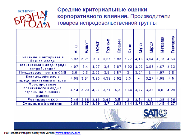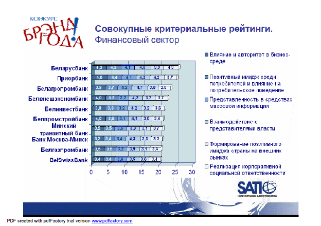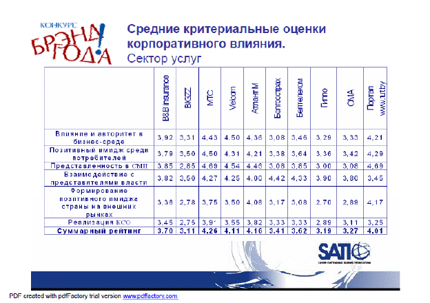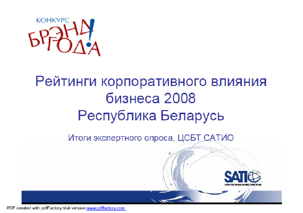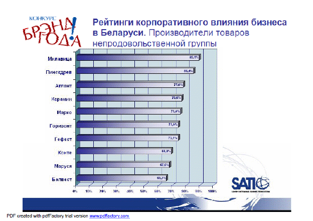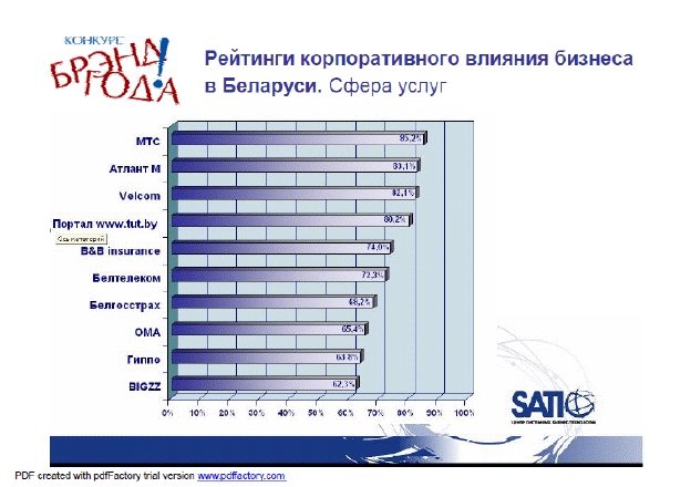 Таким образом, формирование позитивного корпоративного имиджа предприятия — процесс сложный и многогранный, требующий особого внимания и больших усилий. Любая, даже небольшая, организация должна постоянно заботиться о формировании благожелательного отношения общества и сотрудников к себе. Только в этом случае, как показывает практика, можно рассчитывать на долговременный успех. Корпоративный имидж белорусских предприятий Исследования известности и предпочтения брэндов в различных товарных группах и категориях проводятся в рамках профессионального конкурса «Брэнд года» с 2001 года. Это единственное полномасштабное периодическое национальное исследование в Беларуси, которое отслеживает процесс формирования брэндового сознания потребителей в различных товарных группах. Данный профессиональный конкурс в потребительской номинации определяет победителей на основе Национального опроса с выборкой в 1000 респондентов. Исследование охватывает все регионы страны и проводится методом телефонного интервью. Отчет об итогах национального опроса получают все участники конкурса. Данные учитывают социальную дифференциацию потребителей по возрасту, полу, роду деятельности, региону, уровню дохода, образованию, семейному положению. Для определения брэндов-лидеров используются открытые вопросы для спонтанного вспоминания торговых марок. Товарные группы допускаются к конкурсу на основе экспертных оценок по признаку наличия брэндовой конкуренции в группе. «Брэнд года» - это профессиональный конкурс, оценка результатов которого проводится по принципиальным стандартам современного маркетинга, брэндинга и маркетинговых коммуникаций. В основу оценок положена стратегия брэнда и потребительская оценка известности и предпочитаемости брэндов. В рамках конкурса осуществляется национальный мониторинг известности и популярности брэндов в группах потребительских товаров. Программа конкурса включает широкий круг образовательных мероприятий, направленных на обмен современным опытом в области маркетинга и брэндинга: Международная конференция ADVANCEDBRANDING, Саммит Директоров, Международные мастер-классы маркетологов и брэндологов с мировыми именами. В рамках конкурса в Беларуси совместно с Национальной инициативой «За социальную ответственность бизнеса» при поддержке ПРООН в Беларуси, Инициативы ООН «Глобальный договор» учреждена номинация «Социально ответственный брэнд». Целью данной номинации является развитие ценностей СОБ и популяризация опыта социальной ответственности бизнеса. В январе 2009 впервые в рамках профессионального конкурса «Брэнд года» оргкомитет конкурса и штаб SATIO подвели итоги рейтингов корпоративного влияния бизнеса в Республике Беларусь. Практика определения рейтингов корпоративного влияния широко распространена в мире. Целями данных рейтингов является определение содержания и характера влияния лидеров бизнеса на экономику, общество и макро-экономическое регулирование. Для Республики Беларусь подобное экспертное исследование рейтингов в 2008 году проведено впервые. Результаты исследования важны как для формирования странового имиджа, так и для расширения диалога бизнеса и власти. Предприятия — лидеры рейтингов по общему признанию обладают наиболее высоким уровнем влияния на формирова