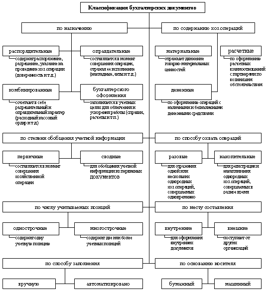 Таким образом, бухгалтерский учет осуществляет сбор, регистрацию и обобщение информации о хозяйственной деятельности предприятия путем сплошного, непрерывного и документального учета всех хозяйственных операций в едином денежном измерителе. 1. Сущность и значение документов Порядок составления документов определен Федеральным Законом «О бухгалтерскомучете» в ст.9 и «Положением о документах и документообороте в бухгалтерскомучете», утвержденным приказом Минфина СССР №105 от 29 июля 1983г.Документы – это письменное распоряжение на совершениехозяйственной операции или письменное подтверждение факта осуществленияоперации.Документы являются источником учетной экономической информации, используемойв управлении, контроле и анализе хозяйственной деятельности, обеспечиваютсохранность собственности, имеют правовое и юридическое значение, являютсяписьменными доказательствами при спорах.Разрабатывают формы первичных учетных документов Госкомстат, Госстрой,Минтруда и ЦБ РФ.Показатели и значения в унифицированных формах в организации не должныменяться, они могут дополняться по необходимости.Кассовые и банковские документы изменению не подлежат. Документы классифицируются:ПО НАЗНАЧЕНИЮ: 1. оправдательные (накладная, счет, кассовый ордер);2. бухгалтерского оформления (бухгалтерская справка, расчеты);3. распорядительные (платежные поручения, кассовый ордер, приказ о приеме наработу и зачисление в штат)4. комбинированные (расчетно-платежные ведомости).ПО ОБЪЕМУ СОДЕРЖАНИЯ: 1. первичные (кассовый ордер, требование, накладная, чек)2. сводные (авансовый отчет, расчетно-платежная ведомость).ПО СПОСОБУ СОСТАВЛЕНИЯ: 1. разовые (требования, накладные);2. накопительные (лицевой счет, лимитно-заборная карта).ПО МЕСТУ СОСТАВЛЕНИЯ: 1. внутренние (накладные-требования);2. внешние (платежные требования или поручения, выписка банка).Классификация бухгалтерских документов Все хозяйственные операции должны производиться с оформлением первичных документов, на основании которых ведется бухгалтерский учет. Документы бухгалтерского учета классифицируются по различным признакам: