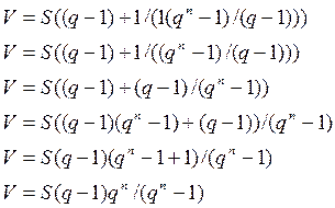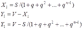 Теперь надо рассчитать размер ежемесячного (разового) платежа V. Чтобы с каждой выплатой долг уменьшался, размер разового платежа должен превышать сумму набежавших за месяц процентов, то есть разовый платёж состоит из двух частей: процентов за пользование деньгами Y и части основного долга X. То есть платёж за k-й месяц можно обозначить как