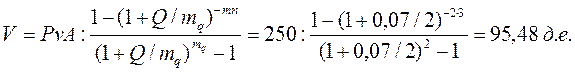 Определить общий размер равных срочных уплат ( Рассмотрим ситуацию всесторонне. Общая сумма долга, по оценке на текущий момент, будет периодически уменьшаться в будущей оценке на одинаковую величину, пока не исчерпается совсем. Рис. 2 Равные срочные уплаты при погашении долгаОчевидно, 250 д.е. следует трактовать как сумму современных величин, равных срочным уплатам Поэтому: