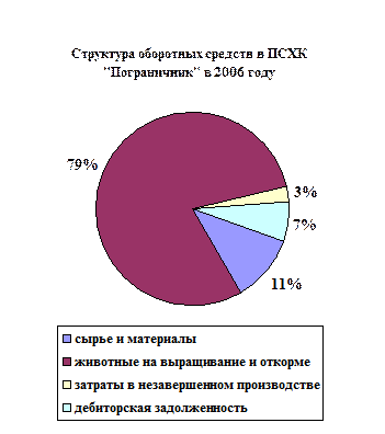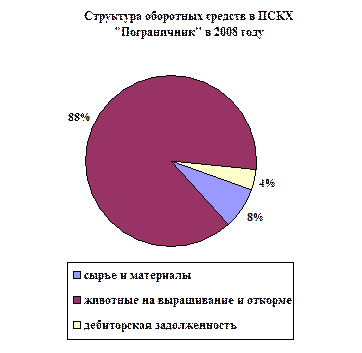 По данным таблицы можно сделать выводы о том, что наибольший удельный вес в структуре оборотного капитала занимают запасы, стоимость которых год от года повышается и на конец 2008г. составила 1550 тыс. руб. Кроме того, их удельный вес в общем объеме оборотных средств также увеличился с 93,4% до 96,0%. Данный рост был вызван увеличением количества и стоимости животных, находящихся на выращивании и откорме. При этом стоимость сырья и материалов в 2008 году увеличилась по сравнению с 2006 г. на 2 тыс. рублей (или 2%), но по сравнению с 2007 годом она снизилась на 13 тыс. руб. или 9,4%. Данные 2008 года свидетельствуют о снижении оборотных активов с несущественной степенью риска. Произошло это, главным образом, за счет уменьшения размеров краткосрочной дебиторской задолженности в 5,3 раза или на 148 тыс. руб. Наблюдаемое нами уменьшение размеров дебиторской задолженности, несомненно, является положительным моментом, что свидетельствует о снижении отвлечения из хозяйственного оборота собственных оборотных средств, значимость которых тем существеннее, чем выше темп инфляции в стране. Сокращение доли оборотных активов со средней степенью риска, занимающей наибольшей удельный вес в сумме оборотных средств сельскохозяйственного кооператива ПСКХ «Пограничник» в 2008 году по сравнению с 2006 годом на 185 тыс. руб. (или в 2,3 раза) объясняется снижением размеров средств, в виду их недостатка, авансируемых в производственные запасы. А они и материальные ресурсы играют важную роль в обеспечении эффективности использования оборотного капитала. Отметим, что удельный вес материальных производственных запасов, относящихся к оборотным активам со средней степенью риска, сокращается и в сельскохозяйственных организациях в целом по стране.