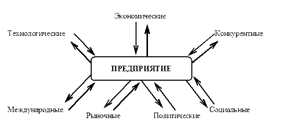 Основные конкуренты: ресторан «Чайная Ложка», удаленность от кафе «ПИТЕР» 600 м.; ближайшие закусочные бистро «РубльБлин», «БлинДоналдс» (4 шт.), удаленность 100 - 400м.; торговый развлекательный комплекс «Атмосфера», удаленность 700 м. Выбранное место - пересечение Торфяной дороги и Богатырского проспекта является оптимальным, поскольку круг предполагаемых посетителей кафе исчисляется из: «Бизнес Центр» и «Северо-западный таможенный терминал» - до 60% клиентов; Автосалон; прохожие (Новостройки). Так как внешняя и внутренняя среда кафе изменяются под воздействием различных факторов, представленных в (Рис.2), то необходимо выявить ограничения, сильные и слабые стороны. Рис. 2 Воздействие факторов внешней среды на предприятие