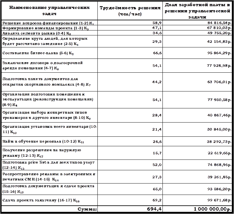Расчет трудоемкости работ по проектуПосле определения весовых коэффициентов, производим расчёт коэффициента трудоёмкости каждой управленческой задачи. Для расчёта трудоёмкости составляем матрицу предпочтений (попарных сравнений). Техника заполнения аналогична предыдущей матрице. Управленческой задаче (в строке), получившей наибольшее количество баллов, присваивается значение, равное единице, все остальные управленческие задачи определяются как отношение между наибольшим и остальными (относительно самой трудоёмкости задачи). Зная рассчитанные весовые значения и коэффициенты, можно определить общую трудоёмкость каждой управленческой задачи и загруженность структурных подразделений (должностных лиц, исполнителей): 1) Cti = Kti * ∑V0 i , Cti – трудоёмкость решения управленческой задачи по i-ой строке; Kti – коэффициент трудоёмкости i-ой задачи; V0 i – весовые символы, которые соответствуют i-ой задачи; 2) Ctj = ∑(Kti * V0 j ), Ctj – трудоёмкость структурного подразделения (должностного лица), принимающего участие в каждой i-ой управленческой задаче. Зная трудоёмкость и загруженность структурных подразделений (должностных лиц), можно рассчитать заработную плату по исполнителям или долю заработной платы в решении каждой управленческой задачи (предположим, что выделен фонд заработной платы на весь проект (ФЗП)): 1) Fi = ФЗП/∑Cti – заработная плата, приходящаяся на единицу трудоёмкости; 2) Fj = ФЗП/∑Ctj Таблица №6. Трудоёмкость и доля заработной платы в решении каждой управленческой задачи