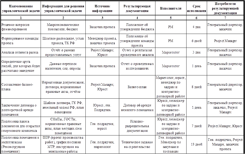 Информационно-технологическая модель проектаИнформационно-технологическая модель (ИТМ) – организационная модель управления проектом, которая является основным организационным инструментарием управления проектом, характеризующим все процессы по управлению проектом в определённой технологической последовательности и взаимосвязи. Информационно-технологическая модель – модель процесса управления, содержащая стандартное описание порядка и условий решения задач управления проектом, в которой чётко определяется кто, когда и в каких условиях решает те или иные задачи, и кто несёт ответственность за их реализацию. Разработка и внедрение информационно-технологической модели обеспечивает: 1) создание условий в системе управления проектом, когда промежуточные результаты надёжно обеспечивают достижение конечных целей проекта; 2) последовательность задач по управлению проектом и определение условий их реализации. Информационно-технологическая модель также способствует: 1) чёткому разделению и специализации труда в проекте; 2) координации решения взаимосвязанных задач в проекте; 3) оптимальному взаимодействию с окружающей средой; 4) адресации конкретных документов отдельным исполнителям; 5) стандартизации приёмов и методов решения однотипных задач; 6) определению трудоёмкости управленческих задач и качеству исполнения; 7) организации мотивации участников команды проекта. Построение информационно-технологической модели начинается со сбора информации о процессах проекта, которая собирается путём анкетирования, интервьюирования и опроса специалистов. Процесс сбора информации обязательно должен быть подкреплён приказом высшего руководства. Для успешного сбора исходных данных необходимо провести соответствующую разъяснительную работу с сотрудниками, заполняющими анкеты и дающими информацию. Правильно заполненная и проанализированная информационная таблица является основой для создания информационно-технологической модели. После получения данных производится анализ для определения технологических и логических связей между отдельными работами, который производится на основе информационной таблицы. Информационная таблица Информационная таблица разрабатывается на первом этапе построения организационной модели управления проектом (УП): 1) 1 столбец – содержит полный набор управленческих задач, соответствующих данному проекту; 2) 2 столбец – вписывается исходная информация, необходимая для решения данной задачи (это может быть ГК РФ, свод федеральных законов РФ, нормативные акты, договора и проекты договоров, учредительные документы, материалы анализа, отчёты, акты, директивы вышестоящих органов, организаций, информация об участниках проекта, а также информация, полученная при решении других управленческих задач); 3) 3 столбец – источники исходной информации (организационные подразделения, отдельные должностные лица, предоставляющие необходимую информацию для решения управленческой задачи); 4) 4 столбец – результирующая документация (приказы, протоколы, отчёты, устав, учредительные документы, планы и т. д.), получаемая в результате решения соответствующей задачи; 5) 5 столбец – включает перечень исполнителей задач, структурных подразделений, которые решают управленческие задачи и преобразуют в ходе их