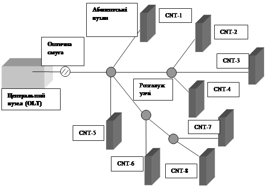 ПАСИВНІ ОПТИЧНІ МЕРЕЖІ 1. Загальні принципи передачі та прийому Пасивні оптичні мережі PON (passіve optіcal network) – сімейство технологій широкополосного доступу по оптичному волокну. Суть технології складається у використанні одноволоконної оптичної лінії за принципом «точка-багато точек» без проміжних оптичних підсилювачів. Відводи до споживачів виконуються за допомогою розгалужувачів (спліттерів) – дільників оптичної потужності. Структурно пасивна оптична мережа складається із трьох елементів: центрального вузла (OLT), пасивних оптичних розгалужувачів (мережевих вузлів) і абонентських вузлів (ONT) (рис. 1).
