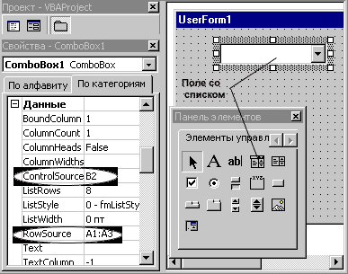 Построим для примера пользовательскую форму, содержащую элемент управления (Поле со списком)