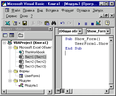 Теперь надо сделать так, чтобы пользовательскую форму можно было запускать непосредственно из Excel: