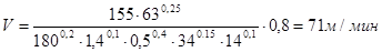 где Knv =1– поправочный коэффициент, учитывающий состояниеповерхности заготовки. Kм v =0,8– коэффициент, учитывающий влияние физико-механических свойств обрабатываемого материала. Kuv =1– коэффициент, учитывающий влияние инструментальногоматериала. Kv = 0,8 × 1 × 1 = 0,8 С v = 155; q = 0,25; x = 0,1; y = 0,4; u = 0,15; p = 0,1; m = 0, 2