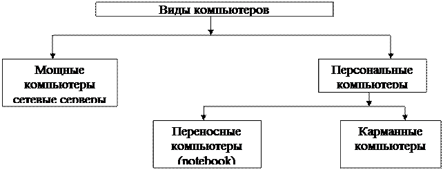 Рис. 2.1. Классификация компьютеров по видам Во главе стоят самые мощные и высокопроизводительные компьютеры, так называемые большие компьютеры . Их главная задача - это обработка большого количества данных и моделирование различных ситуаций. Применяются такие машины в основном в военных целях и в крупных университетах научных центрах, для прогнозирования и для исследовательских задач. Подобного типа машины, применяются и в шоу-бизнесе для создания сложных и масштабных спецэффектов. Специфика этих, «кино» компьютеров, наличие мощнейшей видеосистемы, необходимой для построения виртуальных моделей. Персональные компьютеры – знакомые всем и самые распространенные на сегодняшний день компьютеры. По своим функциональным возможностям могут применяться практически в любом роде деятельности. Современные технологии позволили построить доступную и высокопроизводительную систему, каковым и является персональный компьютер. Классификация персональных компьютеров: В зависимости от выполняемых задачперсональные компьютеры делятся: 1. Рабочие компьютеры , так называемые "рабочие лошадки". Имеют необходимый базовый минимум, системных средств, без присоединения дополнительных мультимедийных устройств. За счет высокоскоростных процессоров, даже на данных моделях обработка информации будет очень быстрой и удобной пользователю. Предназначены для обучения, работы в текстовых редакторах и не сложных графических и математических приложениях. Находят применение в школах, университетах, бухгалтерии, офисах и т.п. 2. Игровые компьютеры - предназначены для удовлетворения потребности человека в развлечении. Самый наглядный пример тому, это игры. Они также хорошо подходят для других не менее важных занятий, таких как просмотр музыкальных видео клипов, кинофильмов, или просто для прослушивания любимых музыкальных произведений. Для современных игр требуются подчас очень мощные и дорогие компьютерные комплектующие, хорошая видео карта, мощный процессор, большой объем оперативной памяти и т.д. Находят применение, как для дома, так и для игровых компьютерных салонов. 3. Мультимедийные компьютеры - предназначены для удовлетворения потребности человека в творчестве и самообразовании. Эти машины служат для занятий музыкой, рисованием, пением, а также помогают и в других творческих замыслах в домашних условиях. Их широко используют для самообразования. Это направление наиболее актуально в наши дни, так как сейчас на рынке программного обеспечения имеется огромный выбор различных систем, которые помогают людям расширять свой кругозор. Имея дома такую машину, например, можно легко и быстро выучить английский язык, можно спланировать дизайн квартиры, или просто получить информацию о любой сфере человеческой деятельности. Находят очень широкое применение, и встречаются в нашем обществе все чаще и чаще. Сетевые компьютеры - предназначены для удовлетворения потребности человека в получении необходимой информации. Эти машины служат для быстрого доступа в компьютерные сети, такие как INTERNET. Имея у себя сетевой компьютер и доступ к всемирной паутине (INTERNET), вы сможете, не выходя из дома, провести поиск покупателя или продавца, заключить договора на куплю или продажу, выяснить изготовителя той или иной продукции, получать информацию с большинс