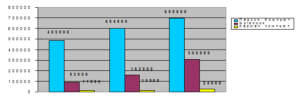 Ручные (карманные) персональные компьютеры , − записные книжки. Маленькие, иногда очень удобные компьютеры, имеющие неплохие счетные возможности. Практически все новые модели имеют встроенный модем, что позволяет, как и в случае с “notebook”-ом выйти в Internet с любого конца света, помогающие получать самую современную информацию, и координировать сложную взаимозависимую работу. Это маленькие по габаритам машины, размером с небольшой ежедневник, с встроенным жидкокристаллическим монитором. Функционально – это записная книжка, с дополнительными возможностями. Большой минус качественные модели стоят достаточно дорого. Изменение ассортиментной структуры рынка компьютерных продаж по г.Брянска можно проанализировать, сопоставив объемы продаж по каждому виду за ряд лет. Динамика изменения объемов продаж за период с 2007-2009 г.г.приводится на диаграмме рис. 2.2. 2007 г. 2008 г. 2009 г. Рис. 2.2. Динамика изменения объемов продаж по видам компьютеров Объем продаж ноутбуков во всем мире стремительно растет. И российский рынок не является исключением. Время, когда новинки иностранных производителей ноутбуков появлялись на российском рынке с существенным запозданием, позади. Уже сейчас презентации новых моделей или технологии проходят практически одновременно в России и за рубежом. Большие экраны (до 15 дюймов), большие жесткие диски и множество отсеков для периферийных устройств делают эти ноутбуки готовыми ко всему. В течение последнего года оснащение ноутбуков, предназначенных для рядового потребителя, существенно улучшилось и термин "замена настольным ПК", обычно используемый в отношении самых быстрых и мощных портативных машин, уже не является преувеличением, как когда-то в прошлом. Многие действительно используют ноутбуки высокого класса вместо настольных ПК. И хотя размеры и масса этих машин великоваты для идеальных дорожных инструментов, обеспечивающих связь из любого места, они будут хорошим подспорьем для специалистов, которые работают в офисе и желают иметь одну машину с вычислительной мощностью настольного ПК, при необходимости пригодную для транспортировки.