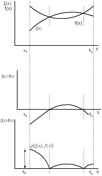 Решив систему уравнений, найдём значения параметров (коэффициенты уравнения f (х)). Хотя такой аппроксимации присущи как и при интерполировании недостатки, однако на практике она находит широкое применение. в) Аппроксимация по Чебышеву. Аппроксимация по Чебышеву, или равномерная наилучшая аппроксимация, формулируется как задача отыскания таких коэффициентов аппроксимирующей функции f (х), при которых наибольшее отклонение функции f (х) от заданной аналитически ξ (х) в интервале аппроксимации было бы минимальным, то есть находится