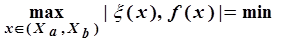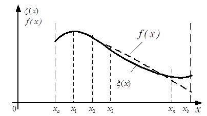 Рисунок 3. Заменим указанный интервал некоторой совокупностью точек ха , х1 ,...., х.. и пусть их число будет равно a. Функцию ξ(х) также заменим совокупностью точек ξ (ха ), ξ (х1 ),...., ξ (хb ) и будем решать задачу чебышевской аппроксимации этой совокупности точек полиномом f(х) = а0 х2 +а1 х+а2 . Можно доказать, что если число точек взято достаточно большое, то результаты решения непрерывной и дискретной задач чебышевского приближения совпадают, с точностью до бесконечно малой величины. Экспериментально установлено, что при аппроксимации полиномами практически достаточным будет выбор числа точек, в 5-10 раз превышающего степень полинома. Для выбранных точек можно записать следующую систему из неравенства: