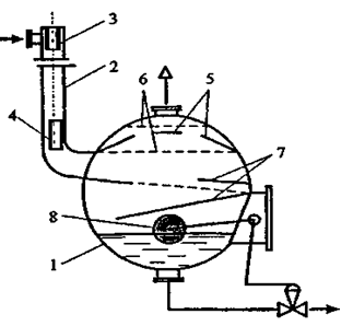 Рисунок 2. Вертикальный сепаратор А — основная сепарационная секция; К — осадительная секция; В — секция сбора нефти; Г— секция каплеудаления; 1 — патрубок ввода газожидкостной смеси; 2 — раздаточный коллектор со щелевым выходом; 3 — регулятор давления «до себя» на линии отвода газа; 4 — жалюзийный каплеуловитель; 5 — предохранительный клапан; 6 — наклонные полки; 7 — поплавок; 8 — регулятор уровня на линии отвода нефти; 9 — линия сброса шлама; 10 — перегородки; 11 — уровнемерное стекло; 12 — дренажная труба Газонефтяная смесь под давлением поступает в сепаратор по патрубку 1 в раздаточный коллектор 2 со щелевым выходом. Регулятором давления 3 в сепараторе поддерживается определенное давление, которое меньше начального давления газожидкостной смеси. За счет уменьшения давления из смеси в сепараторе выделяется растворенный газ. Поскольку этот процесс не является мгновенным, время пребывания смеси в сепараторе стремятся увеличить за счет установки наклонных полок 6, по которым она стекает в нижнюю часть аппарата. Выделяющийся газ поднимается вверх. Здесь он проходит через жалюзийный каплеуловитель 4, служащий для отделения капель нефти, и далее направляется в газопровод. Уловленная нефть по дренажной трубе 12 стекает вниз. Контроль за уровнем нефти в нижней части сепаратора осуществляется с помощью регулятора уровня 8 и уровнемерного стекла 11. Шлам (песок, окалина) из аппарата удаляется по трубопроводу 9. Достоинствами вертикальных сепараторов являются относительная простота регулирования уровня жидкости, а также очистки от отложений парафина и механических примесей. Они занимают относительно небольшую площадь, что особенно важно в условиях морских промыслов, где промысловое оборудование монтируется на платформах или эстакадах. Однако вертикальные сепараторы имеют и существенные недостатки: меньшую производительность по сравнению с горизонтальными при одном и том же диаметре аппарата; меньшую эффективность сепарации. Горизонтальный газонефтяной сепаратор (Рисунок 3) состоит из технологической емкости 1, внутри которой расположены две наклонные полки 2, пеногаситель 3, влагоотделитель 5 и устройство 7 для предотвращения образования воронки при дренаже нефти. Технологическая емкость снабжена патрубком 10 для ввода газонефтяной смеси, штуцерами выхода газа 4 и нефти 6 и люк-лазом 8. Наклонные полки выполнены в виде желобов с отбортовкой не менее 150 мм. В месте ввода газонефтяной смеси в сепаратор смонтировано распределительное устройство 9.