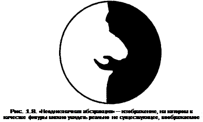 Теперь давайте рассмотрим еще один пример такого типа — так называемый куб Неккера (рис. 1.6). Отличительной особенностью куба является то, что он одновременно является довольно простым объектом, но требует больших усилий и для своего переформирования, и для осознания разницы в интерпретации двух своих вариантов. При первых попытках рассматривания трудно уловить, что происходит, — ясен только сам факт смены одного куба другим. Для упрощения анализа наметим вершины куба и будем записывать, как изменяется положение в пространстве различных граней. Вариант 1: плоскость abed располо-s жена ближе к наблюдателю, плоскость mhnk — дальше; плоскость mhad — боковая, причем внешняя (не заслоненная другими плоскостями); плоскость knbe — боковая, заслоненная; плоскость ahnb — верхняя не заслоненная, плоскость dmkc — нижняя. При переходе к варианту 2 картина меняется во многих отношениях. Плоскости в «новом» кубе остаются теми же, но их расположение уже другое: ближняя становится дальней и, наоборот, дальняя ближней; верхняя плоскость теперь заслонена, заслонена и ранее открытая боковая. Все это дает перемену ракурса, под которым виден куб. Может быть, эти впечатления ловкого трюка подмены одного вида куба другим или же впечатления волшебного превращения (в зависимости от характера испытуемого) являются лучшим показателем эффективности процесса интерпретации: один и тот же исходный зрительный материал может быть «прочтен» нами столь различно! Эффект «двойственности» и неоднозначности восприятия подчеркивается также наличием дополнительных деталей, содержащихся на изображениях- Например, если считать, что сердечко нарисовано на поверхности куба Неккера, спрашивается, на какой грани оно находится? «Ваза или два профиля»? До сих пор мы рассматривали изображения, узнавание которых в основном было связано с тем или иным истолкованием одних и тех же фрагментов некоторой фигуры. Теперь же проанализируем процесс узнавания изображений другого вида; их восприятие связано с разделением одной и той же картины без остатка на разные части: на фигуру и фон, на котором эта фигура расположена. Классическим примером изображений такого типа является рис. 1.7. При одной его трактовке мы видим вазу, при другой — контур вазы распадается, и из его элементов образуются два новых фрагмента, два профиля. Таким образом, получается, что узнавание связано не только с процессом истолкования фрагментов, выделенных из исходного паттерна распределения света и тени некоторым стандартным путем. Оказывается, само разбиение паттерна на части не является однозначным, система восприятия может перебирать способы разбиения, так же как и способы интерпретации полученных фрагментов. Автором этой картины является датский психолог начала XX века Эдгар Рубин. В своих исследованиях Рубин в основном изучал феномен выделения фигуры из фона. В изображении «ваза — профили» фоном и фигурой может служить попеременно то одна, то другая часть. Интересно отметить, что в данном случае решение о классе фигуры зависит от способа разбиения всей сцены на части, но главное, от того, какую часть мы примем для себя за фигуру и какую — за фон. Собственно, «что есть фигура» — вопрос, который кажется простым, однако полный ответ на этот вопрос пока не найден. Ясно одно: выбор фигуры не однозначен. В разбира